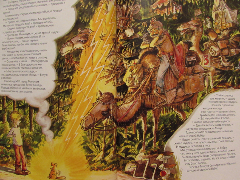 На третьем развороте книги - три мудреца, у которых все кратно ТРЕМ. И соответственно получает от них в подарок третью вещь - заводного бобра.