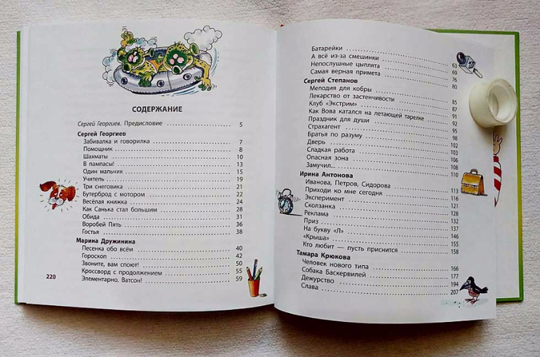 Под твердой квадратном обложкой собраны рассказы пяти авторов (Сергей Георгиев, Марина Дружинина, Сергей Степанов, Ирина Антонова и Тамара Крюкова). Большинство рассказов на 1-2 страницы. Иллюстраций А.Лукьянова много и они не маленькие: на полстраницы и всю. Есть развороты без иллюстраций (около 40).