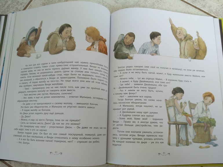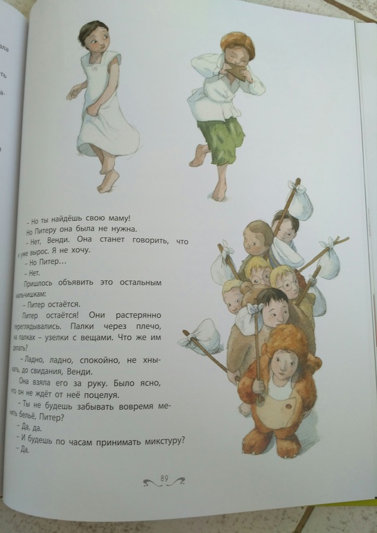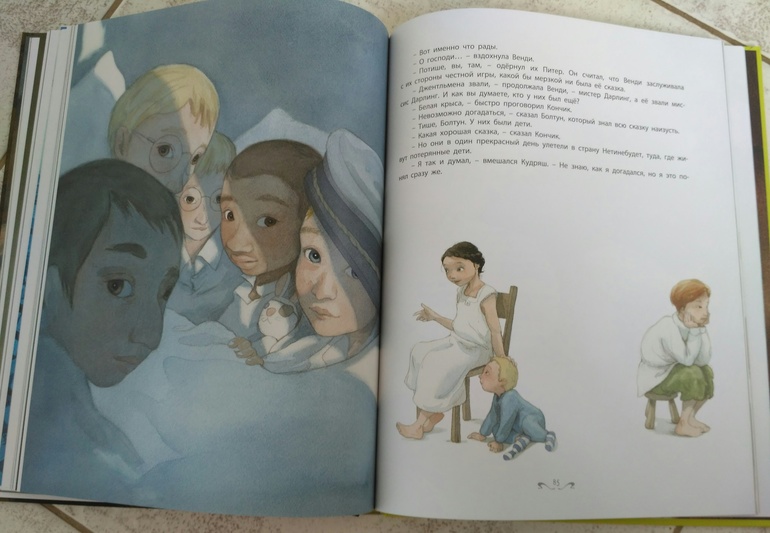 Иллюстрациями Квентина Гребана очень нежные и атмосферные. Сам Питер, Венди, мальчишки с острова, капитан Крюк очень реалистичны и точны.