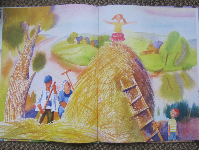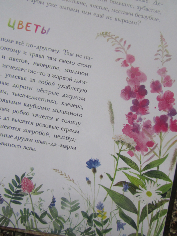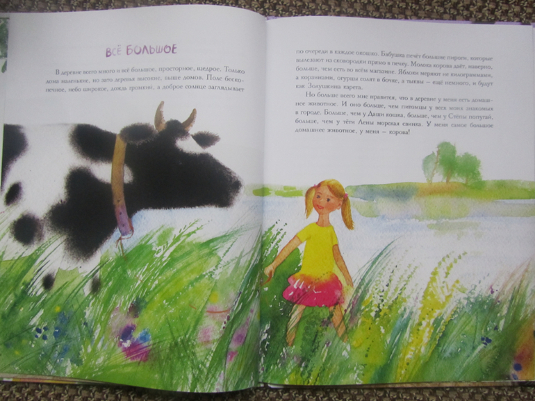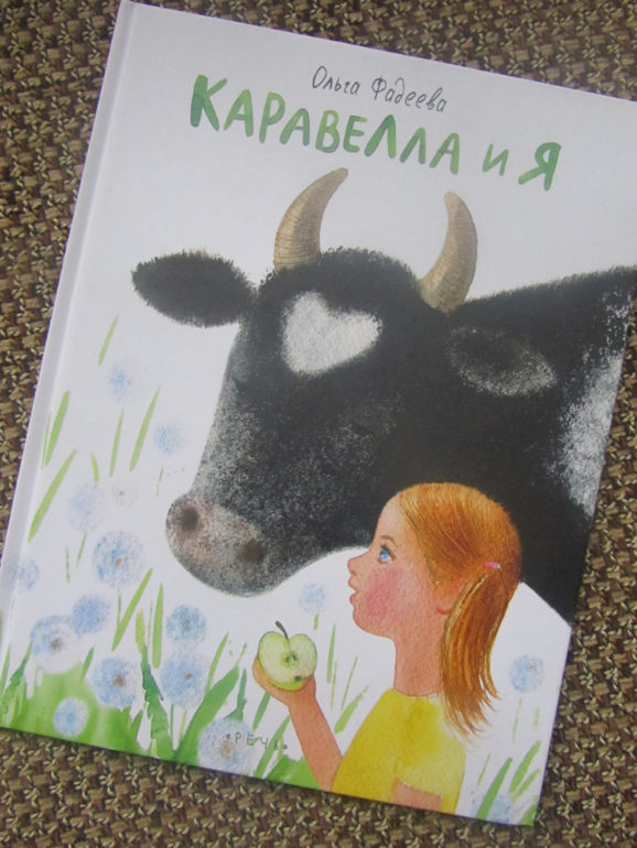 Наконец к концу лета я созрела на Каравеллу и купила эту красочную книгу )) Ну, как говорится - лучше поздно, чем никогда )) Книга конечно прежде всего впечатляет своими рисунками - они чудо как хороши! все эти одуванчики, огурчики..Текст спокойный, повествовательный. Я думаю мою дочь тоже бы впечатлила настоящая корова, ведь она вблизи её ни разу и не видела (( И думаю моя дочь под таким впечатлением тоже бы придумывала и плавания с ней по бескрайним зелёным лугам и полёты в звёздную яркую летнюю ночь )) Ах, как жаль, что у нас нет бабушек-дедушек в деревне 😟 Мы недавно проезжали мимо одной станицы, так там гуси, курочки, индюшки гуляли - восторга детей не было предела, а тут настоящая большая корова совсем рядом..эх. Прочитали книгу быстро, она не очень объёмная, эмоции остались положительными, обязательно следующим летом перечитаем её )).