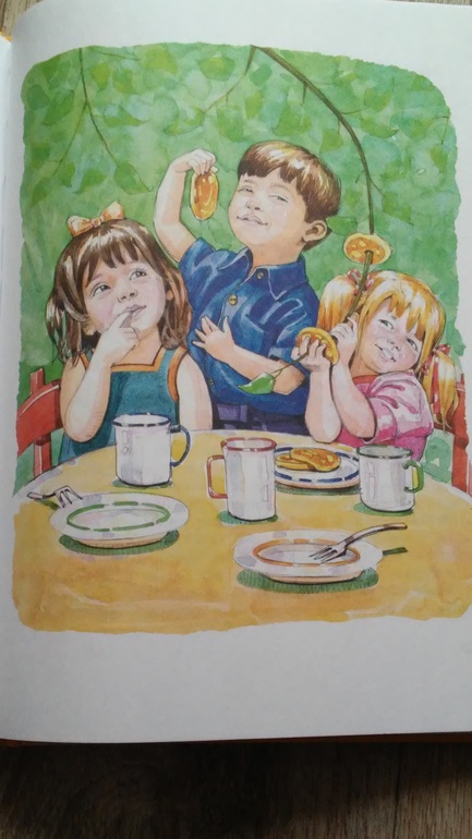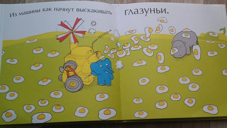 Эпизод с глазуньями всегда очень веселит старшую, ну и мелкая за компанию всегда хихикает. Кстати, благодаря этой книге старшая когда-то полюбила яйца, исключительно в виде глазуньи)