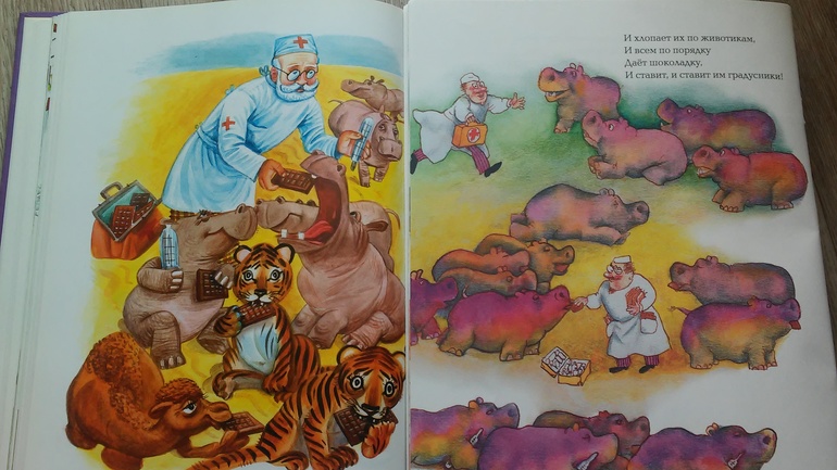 Слева Айболит из сборника, справа Калиновский- дочь предпочитает того, что слева. У Калиновского чудные звери, но не все из текста проиллюстрировано.