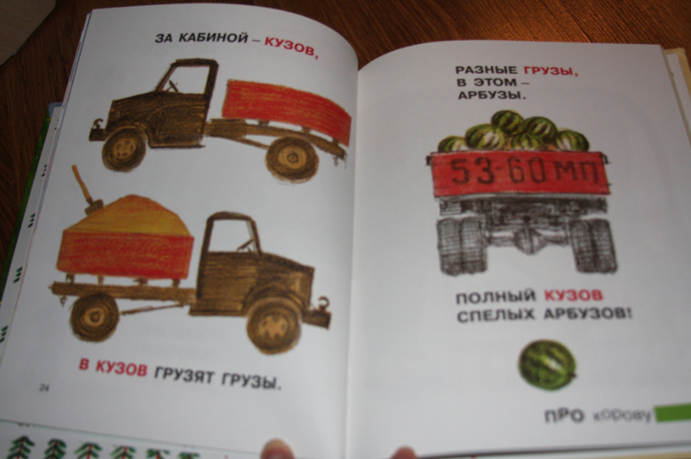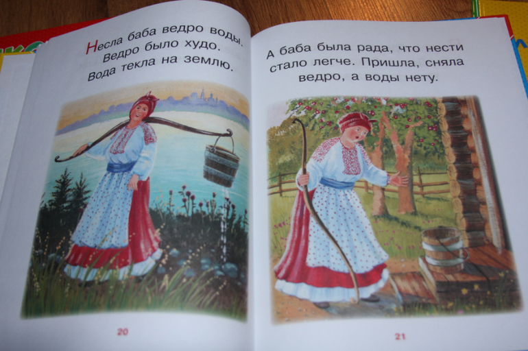 Здесь все, как нам надо: коротко, ясно, без деления на слоги (дочь читает оно- и двусложные слова сразу словами, а если разделено - получается принудительно приходится по слогам), буквы крупные, рисунок соответствует написанному. Читаем, проговариваем, пересказываем, составляем рассказ по картинке - смакуем в общем))