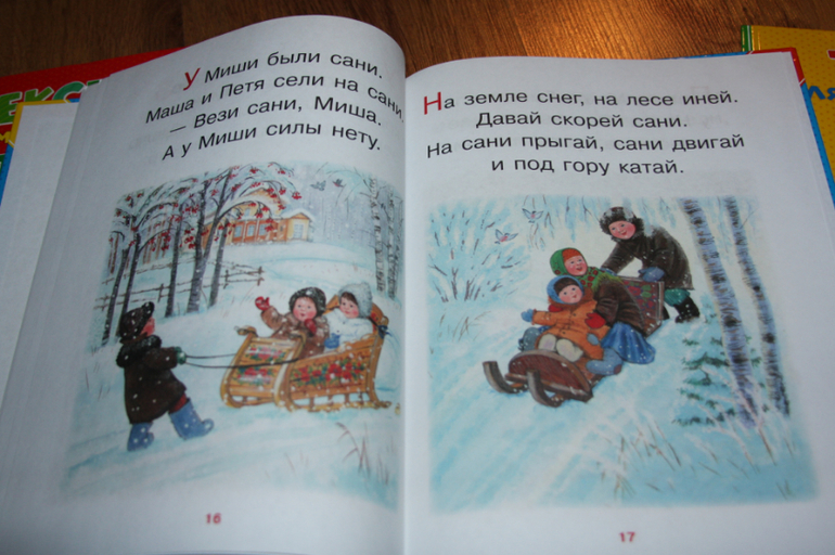 Наша любовь: книжки для первого чтения с большими буквами, понятными историями, ясными (хоть и компьютерными) иллюстрациями.