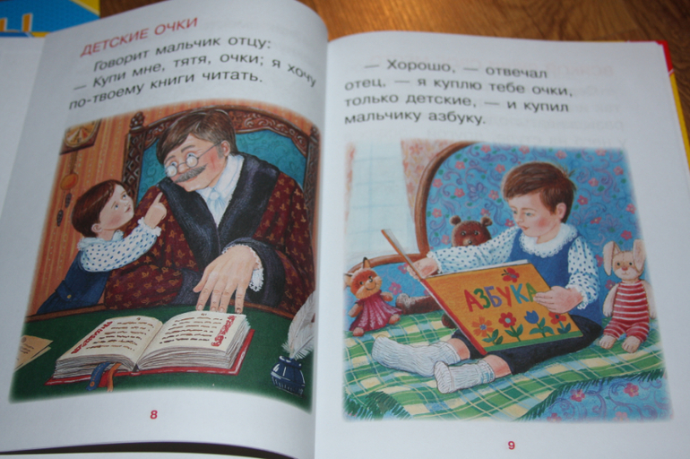 О грустном. Кто-то когда-то нам отдал стопочку, лежала и ждала "первого чтения" и выяснилось, что нам на первое чтение оно не подходит( Веселые истории в основном из школьной (не особо понятной трехлетке) жизни. Ну и иллюстрации так себе в верхних. А в нижних разбивка на слоги в виде дуг под словами. Ребенка отвлекает(