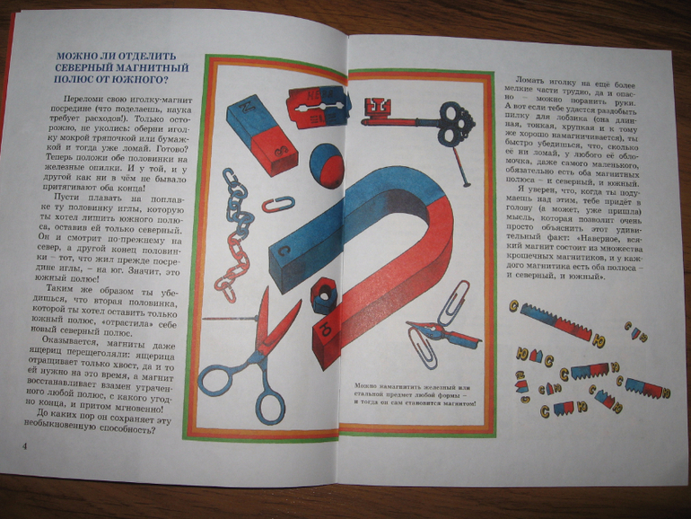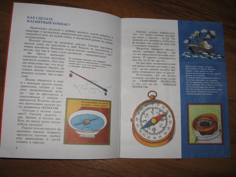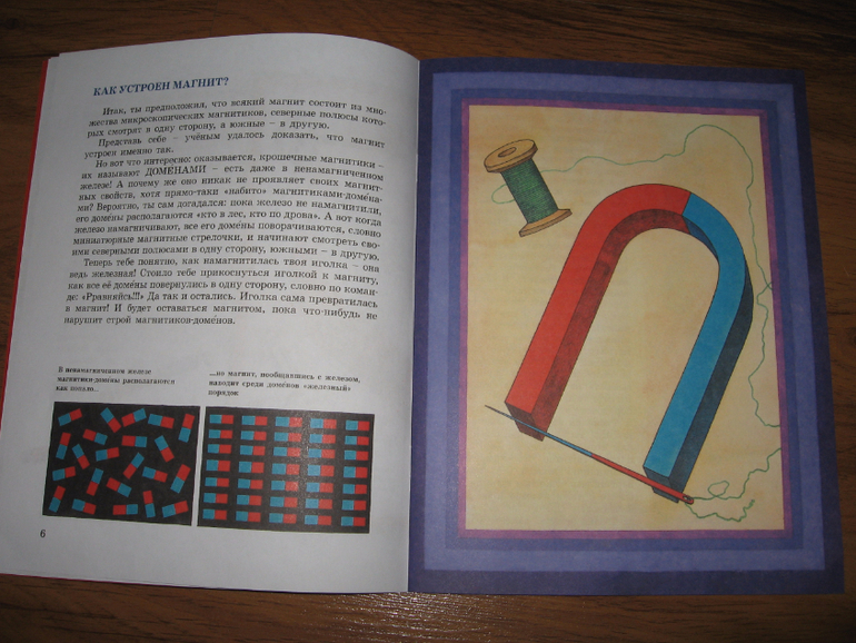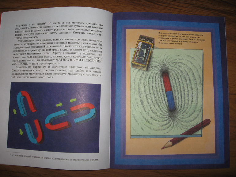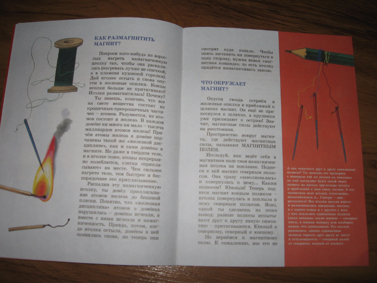 Эту книгу, на мой взгляд, нельзя просто прочитать и отложить. С ней нужно обязательно поработать, поскольку внутри очень много всего интересного описано, что можно легко сделать в домашних условиях, и что позволит ребенку наглядно увидеть явление, более того поучаствовать в этом самому, произвести манипуляции своими руками. Правда мы с Егором книгу пока просто прочитали, а все манипуляции с железными опилками, иголками, мотками проволоки и прочее я оставила на усмотрение папы и на их совместные занятия.