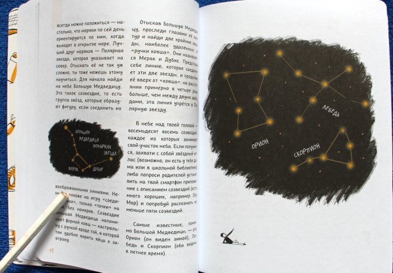 - обучающие моменты - прежде чем кормить животных, изучи их повадки, что едят, где водятся; инструкция, как вязать узлы; как найти созвездие;