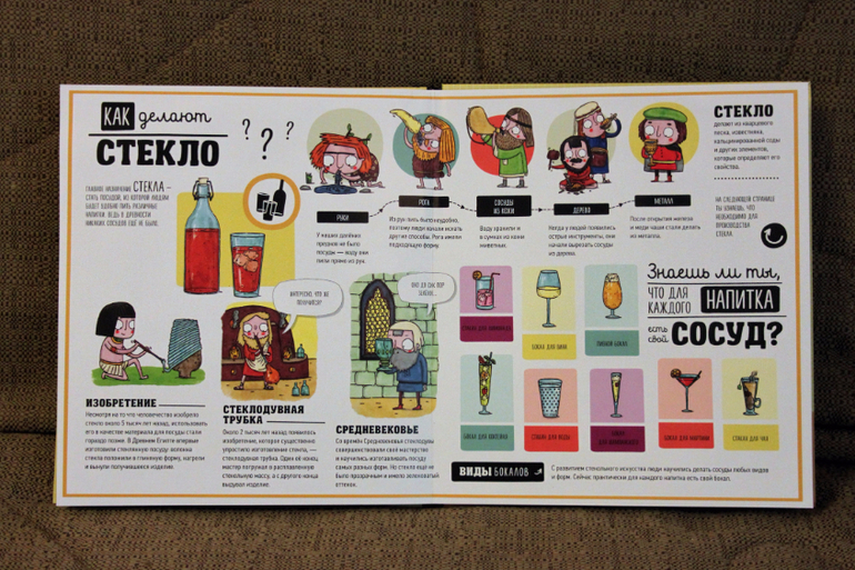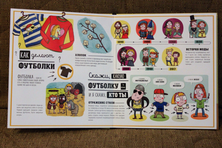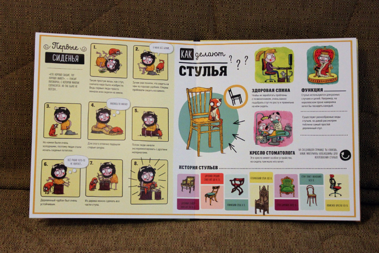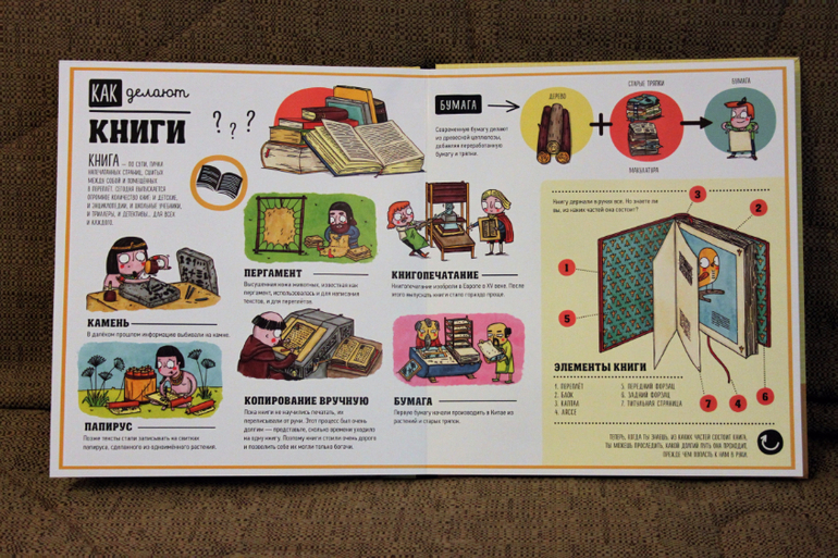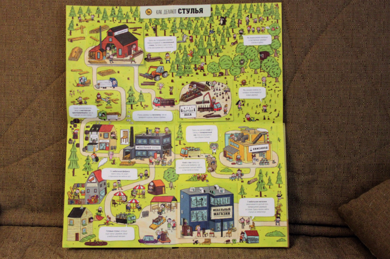 Каждому разделу выделена одна страница и один огромный разворот. Рассказывается о том, когда это появилось и как, а на развороте нарисован весь процесс производства. Как, например, с книгами. От вырубки леса и подготовки щепок, до поступления книги в магазин.