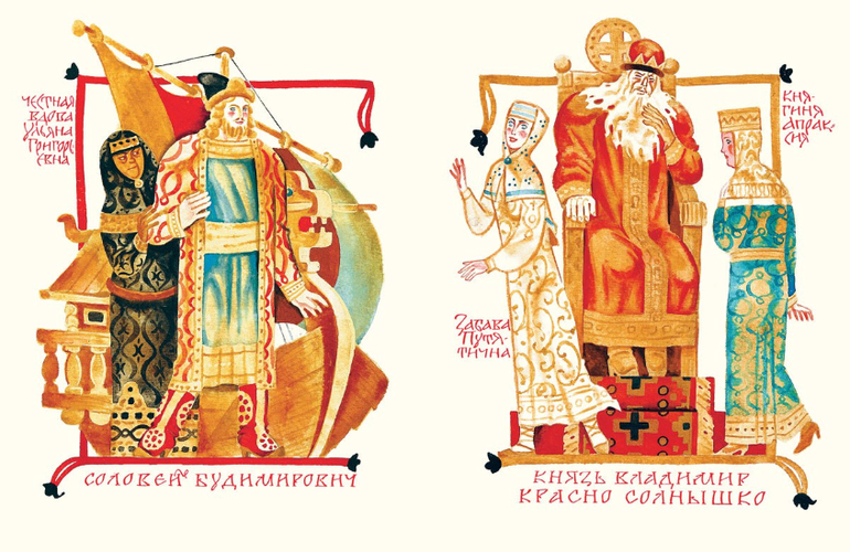 Песни-Былины о великих героях веками пели в народе. Понятными для детей и лёгкими для чтения - при этом стилизованными под живой язык былинных песен - сделал их известный фольклорист Александр Нечаев, выполнивший прозаический пересказ. Художник Владимир Перцов тоже использовал приём стилизации. Каждый его рисунок обрамляется текстом, этот приём когда-то использовался в русских летописях, сами же буквы отсылают нас к уставу и полууставу - типам письма, которыми записывались на Руси исторические события.