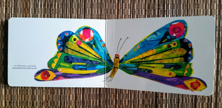 Книга вроде бы простая, но в ней много интересного для малышей - и счёт, и дни недели, и смена дня и ночи, различные продукты и, наконец, процесс волшебного превращения в бабочку.