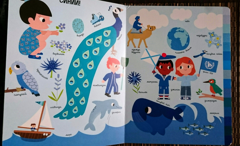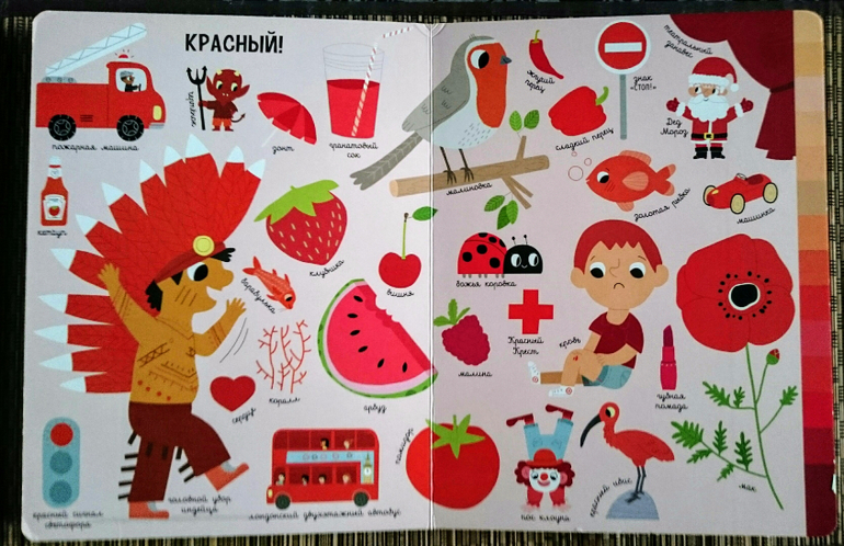 Концепция книжки Цвета в том, что на одном развороте или странице собраны предметы, животные, явления одного цвета.