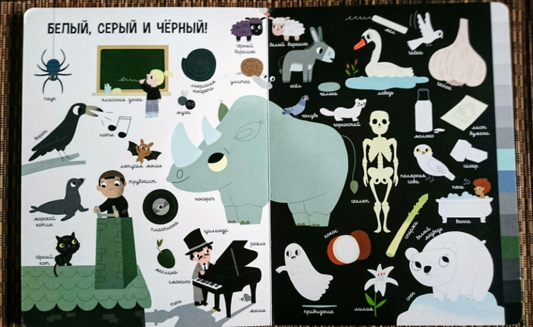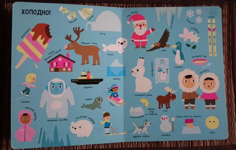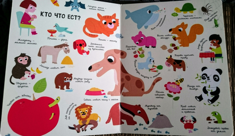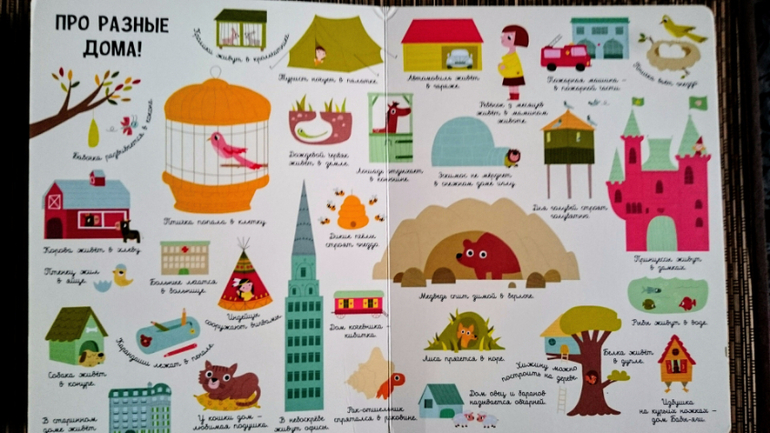 Книгу Обо всём на свете я купила уже на волне успеха Цветов. Концепция похожа, но на одной странице собраны предметы и явления, которые объединяет признак или действие. Например, разные виды домов,всё холодное или горячее, всё высокое, кто что ест т.д.
