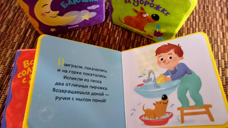 Формат книги дочь оценила, мы много играли с книжечками, строили пирамидки, раскладывали книжечки в нужные ячейки, листали во все стороны и тд. Но в этой серии несколько таких наборов, и например, набор про животных мне понравился гораздо больше. Но когда я покупала книгу, его в наличии не было.