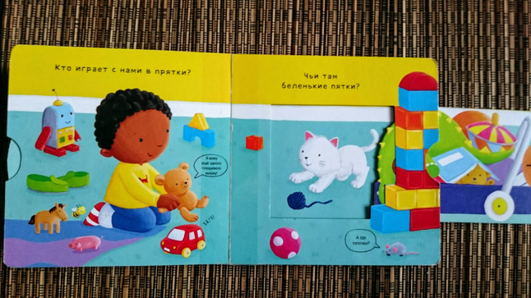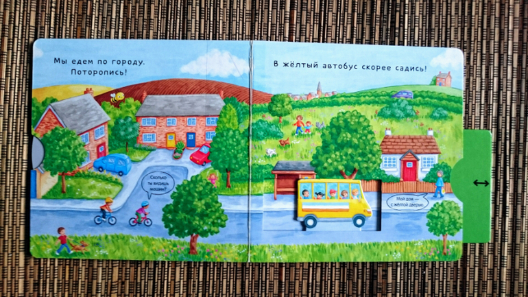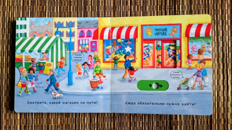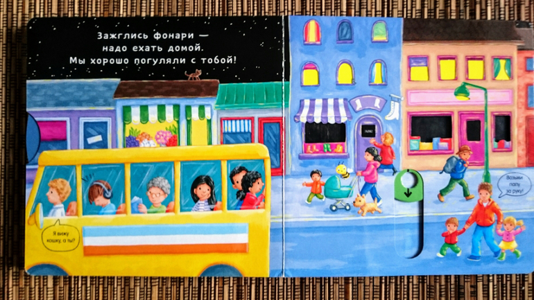 Дочери очень понравились эти книги, ведь если потянуть за край страницы,то автобус едет, или за тележкой с игрушками окажется кошка. А если направить пальчик по стрелке, то в доме загорится свет, в магазине откроется дверь, а мальчик начнёт кататься на лошадке - качалке.