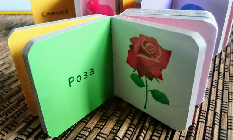 Каждая книжечка сделана из картона, несколько разворотов: слева - слово, справа - картинка.