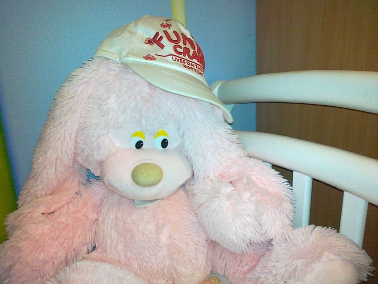 Потом потихоньку обнаружились улики: клочок розой шерсти..., валяющаяся на полу морковка..., загадочная буква "З", пришпиленная к стене рядом с местом, где раньше находилась уточка... Немного напряжённой работы мозга...Эврика! Это мог сделать розовый заяц!!! И точно! Именно у него под кепкой была спрятана пропажа)).