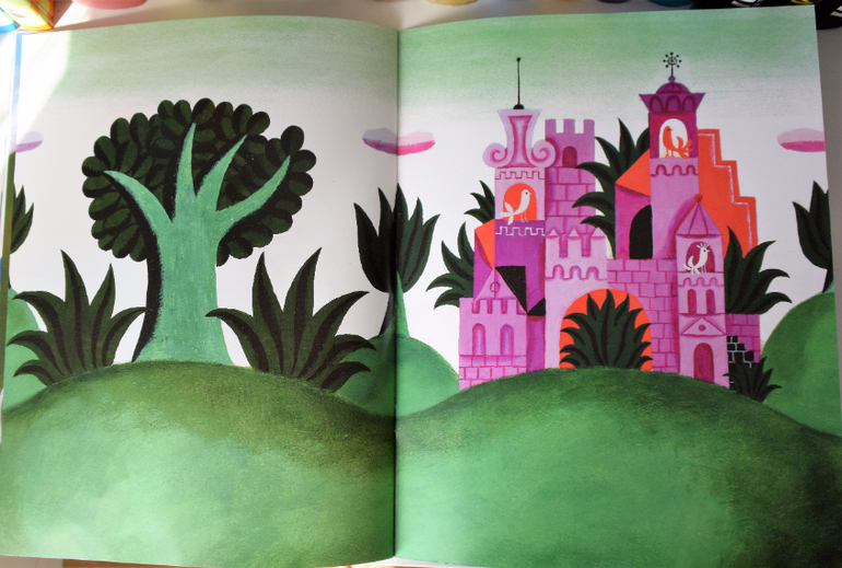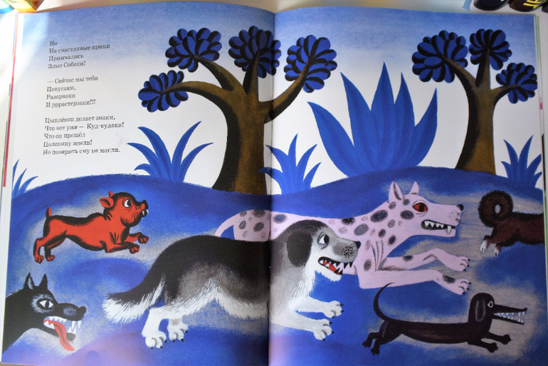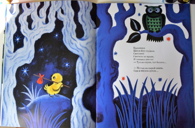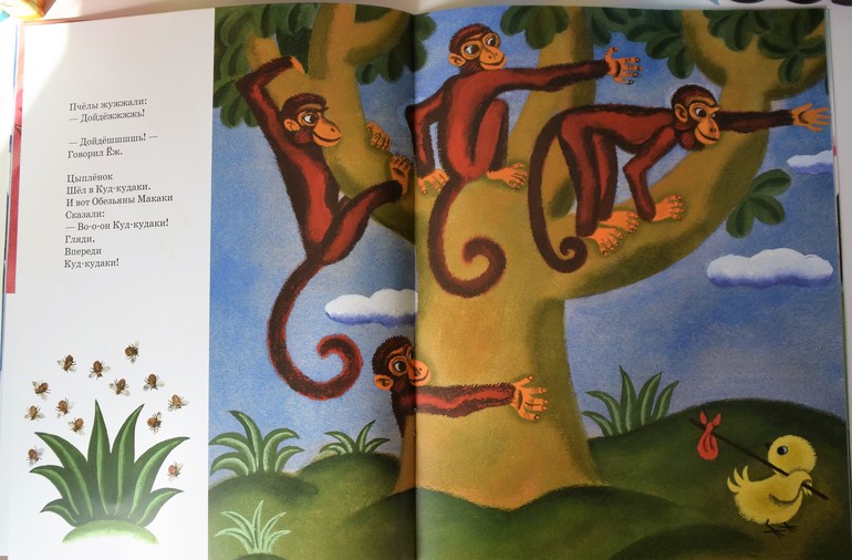 Когда книжку открываем,то видим первый разворот в темных тонах. А когда добираемся к последнему развороту, то окунаемся в буйство красок. Цыпленок добрался в страну Куд-Кудаки! Не испугался, не повернул назад, спасибо всем за поддержку! :)