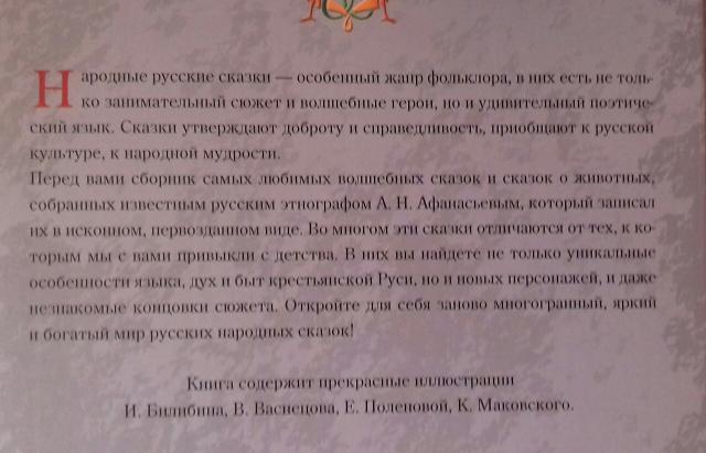 Вывод. Книга хорошая. Иллюстрации замечательные и разнообразные, есть возможность даже сравнить иллюстрации разных художников к одной сказке( например, Аленушка Билибина и Васнецова). Комментарии интересные и по большей части полезные и для школьников, и для взрослых.