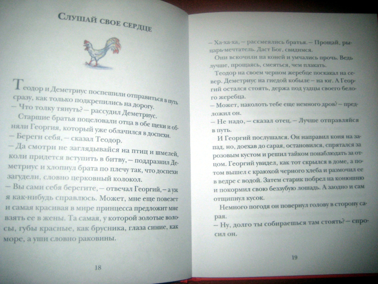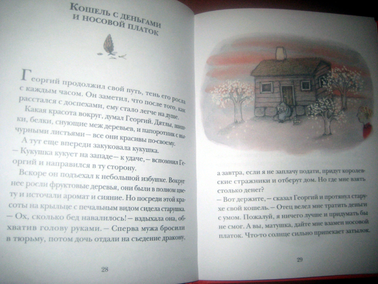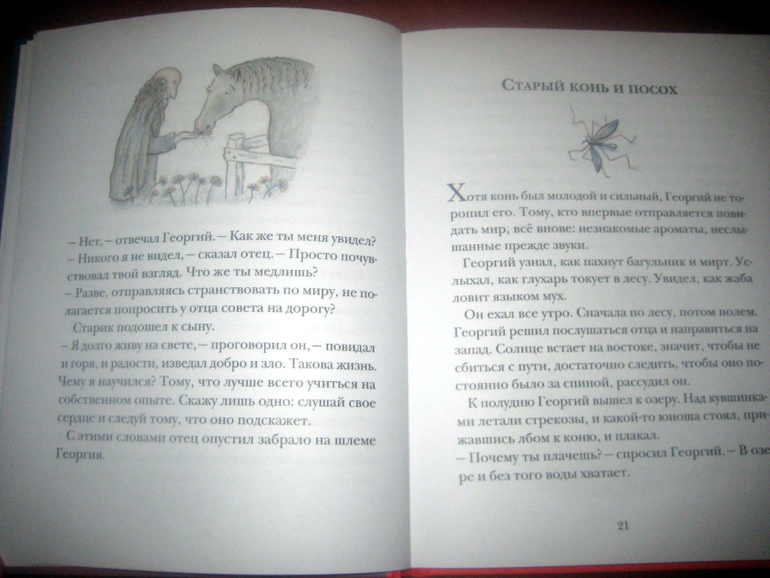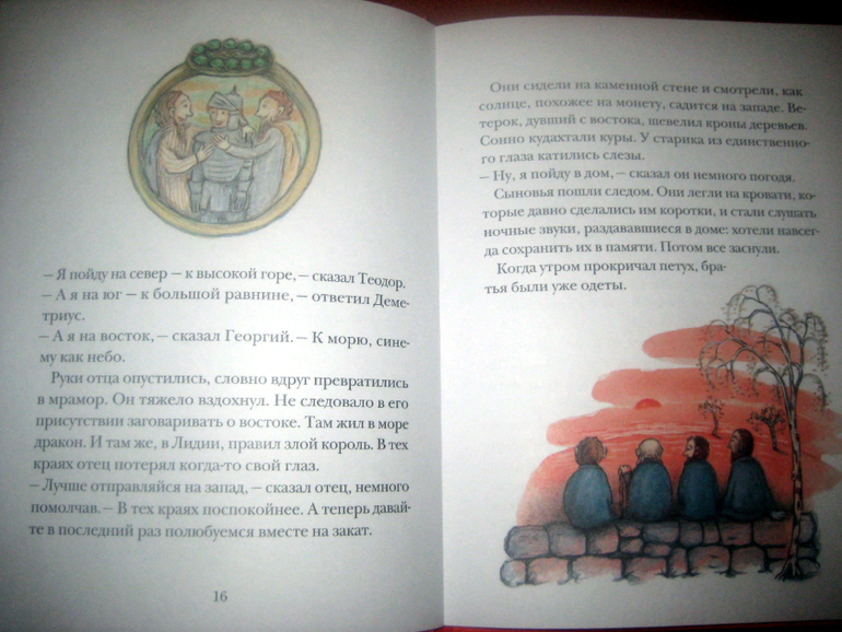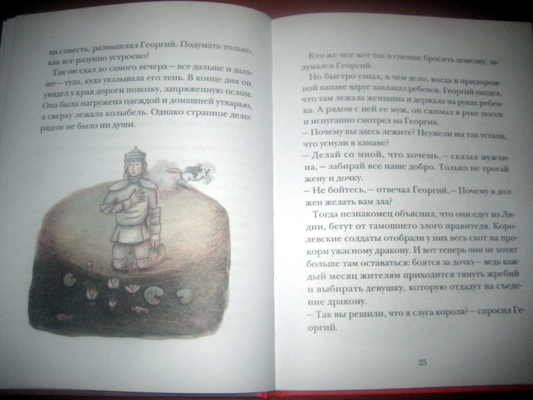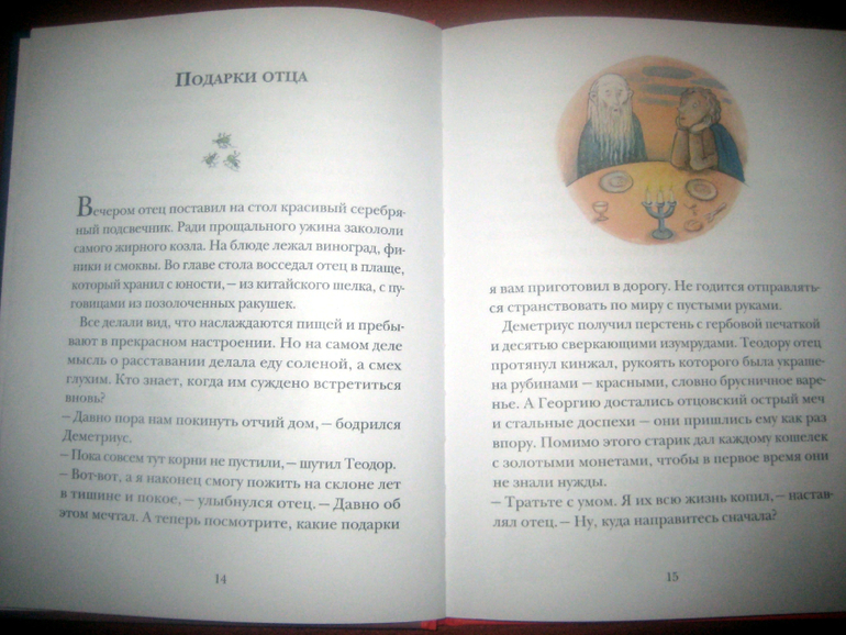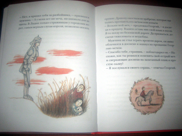 Какая первая мысль приходит на ум, когда узнаешь, что это книга про Георгия Победоносца? Конечно, сразу вспоминается героическая победа над змеем и нимб над головой. Но нет, это не житие святого, как можно было бы подумать. Повествование неожиданно оборачивается великолепной сказкой с интереснейшим сюжетом и всевозможными сказочными атрибутами. Даже начало у нее совершенно в классическом духе: немощный отец призывает к себе сыновей и отправляет их путешествовать по свету, снабжая каждого каким-нибудь даром. Георгию, к слову, достались "отцовский острый меч и стальные доспехи - они пришлись ему как раз впору". И вот пришла пора прощаться: