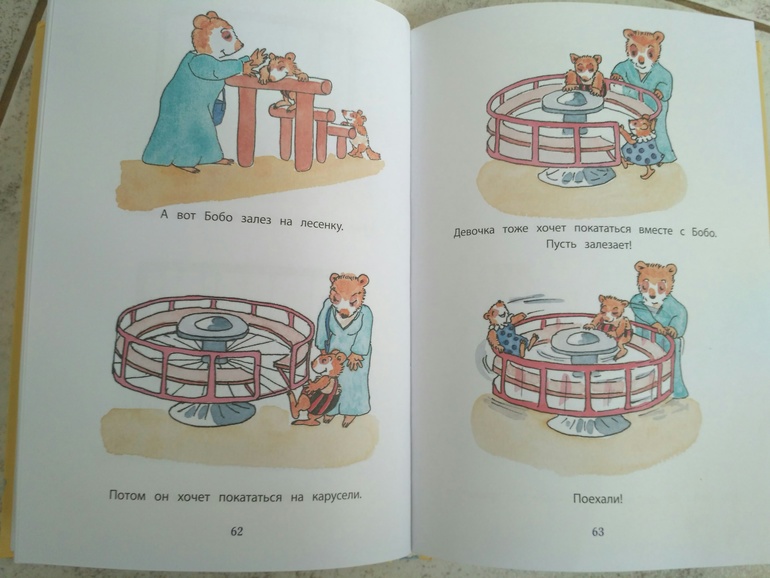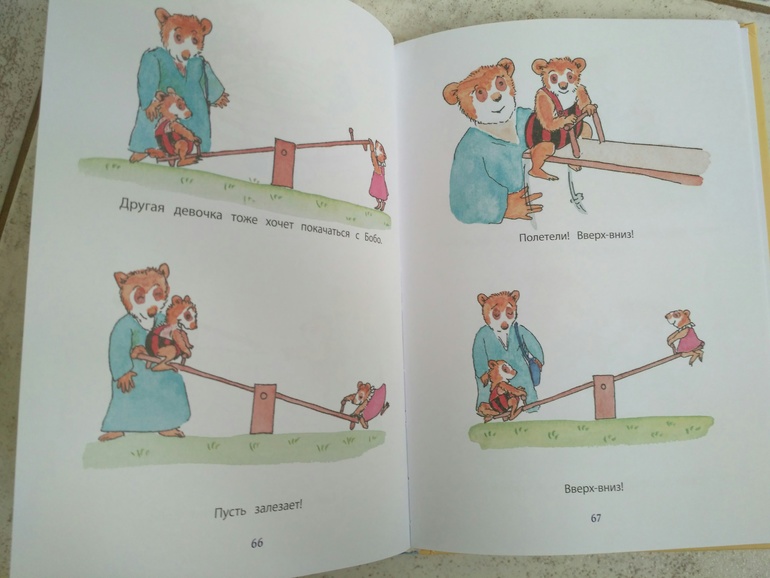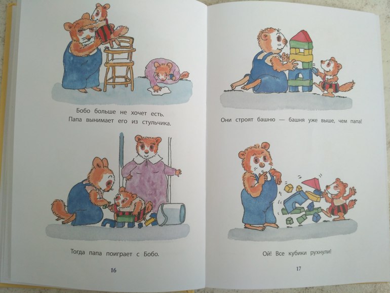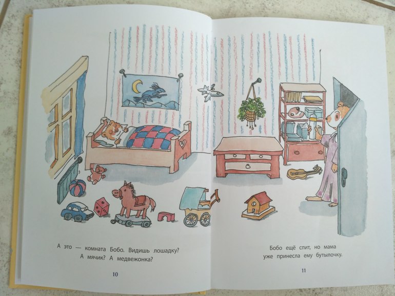 2. Бобо - читаем часто, нравится. Здесь простые повседневные ситуации из жизни, то с чем знаком каждый ребёнок. это просто рассказ по картинкам, причём я обращаю внимание на то что нам актуально на данный момент. Перед переселением в свою комнату я подробно останавливалась на этом развороте, говорила, что Бобо спит в своей комнате, в своей кровати. Мама с папой приходят к нему утром..