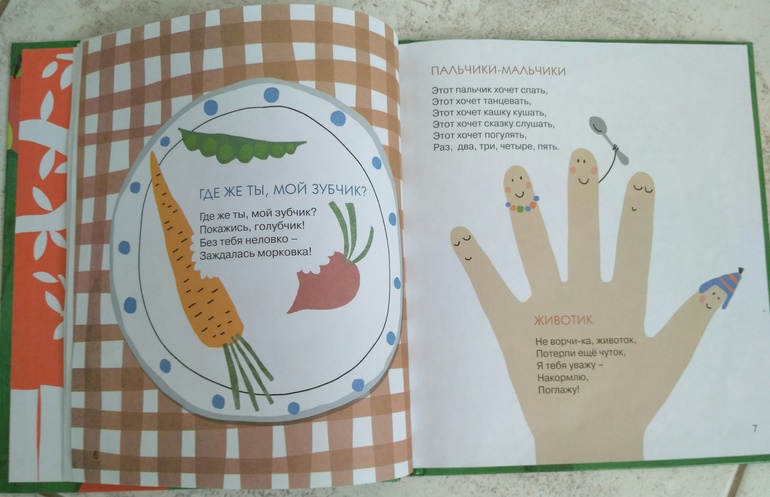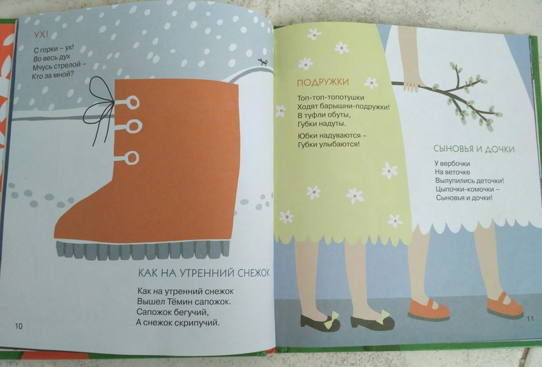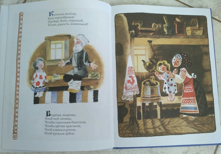 Нравится богатое содержание, потешки здесь на все случаи жизни)) и собраны в хронологическом порядке - утренние про пробуждение и умывания, дневные, с их заботами, вечерние об укладывании спать. О временах года, погодных явлениях. В общем много всяких разных!!