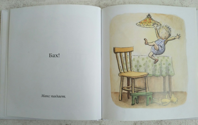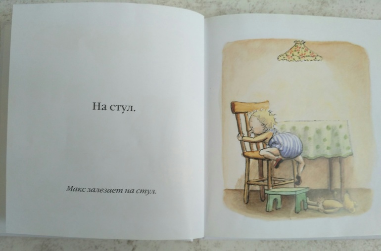 Макс - именно эта книга летом на даче стала хитом, и была прочитана много много раз! Вроде бы банальная история о мальчике, который хотел достать лампу и полез для этого на стол. Но упал!! И разбил ногу. Пришла конечно же мама, и все стало хорошо!