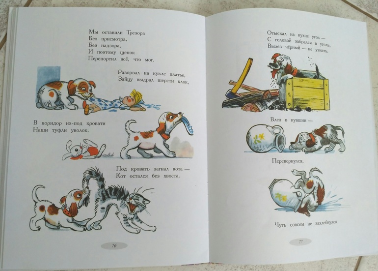 Сборник с иллюстрациями Сутеева долго даже открыть не давала, потом прониклась рельефной собачкой на обложке, нашли мы такой стих в книге, это Михалкова" Трезор " и вот с него начали читать. Замечательное стихотворение, что подробными иллюстрациями :