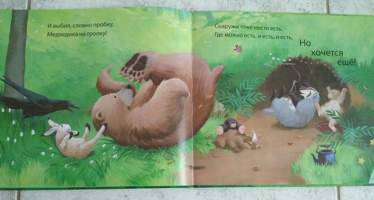 Но Медведик так разъелся к тому времени, что застрял в своей берлоге. Но опять же друзья и выручили.