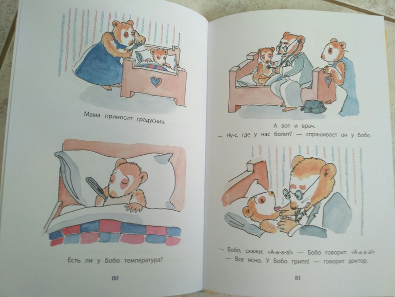 Нравится разворот доктора, после ларингита в сентябре, когда к нам врач приходила 3дня подряд Даша начала играть в доктора, слушает кукол, Аню, нас с мужем, горло смотрит, лекарства из бутылочки наливает, ну и в книге этот момент нравится.