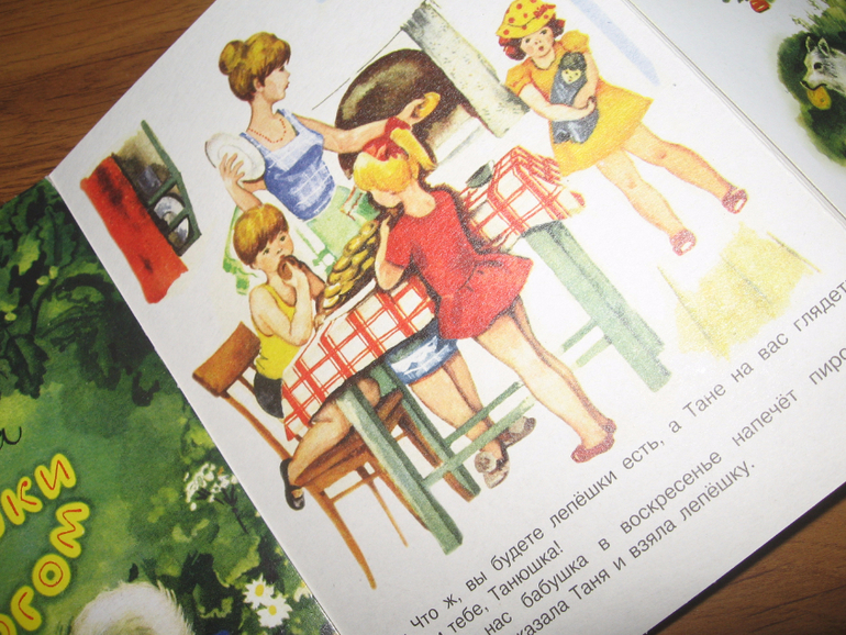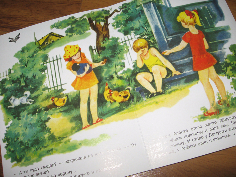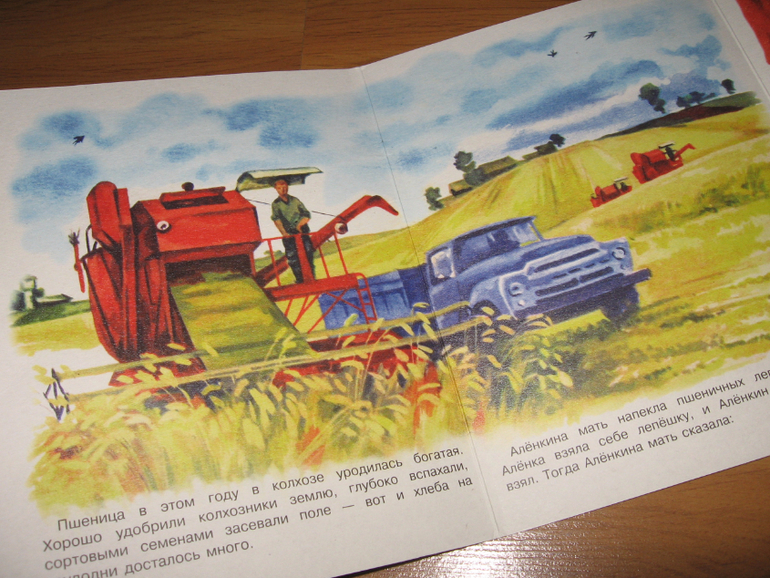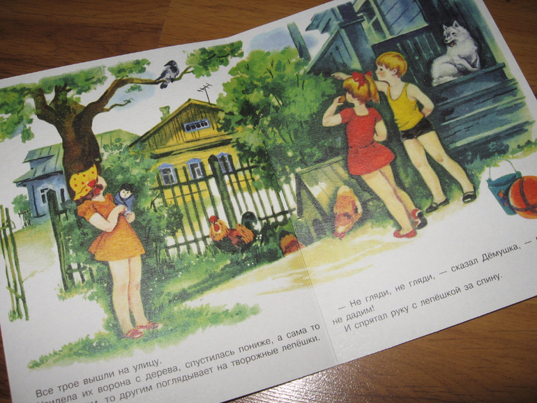 Это картонная книжка-раскладушка, с коротенькой историей, как в колхозе собрали богатый урожай пшеницы и Алёнкина мама напекла лепешек с творогом, дети - Алёнка, Танюшка и маленький Дёмушка - взяли по лепешке и вышли на улицу. Хитрые вороны спустились пониже, завидев лакомство, а Дёмушка, увидев это, спрятал лепешку за спину. Вот в этот момент пёс Снежок у него лепешку-то и стащил. Мальчик начал реветь, а девочки быстро нашли выход из ситуации, просто поделившись с ним своими лепешками.