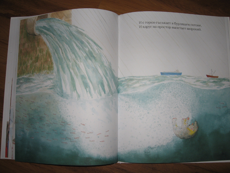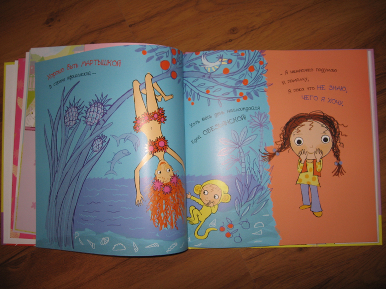 Кроме того, в книге Алисе и иллюстрации пришлись по вкусу, их она может довольно долго разглядывать, разворачивая то так, то эдак. А может и вовсе лечь, развернув книгу полностью, и разглядывать как панораму, то с одной стороны, то с другой.