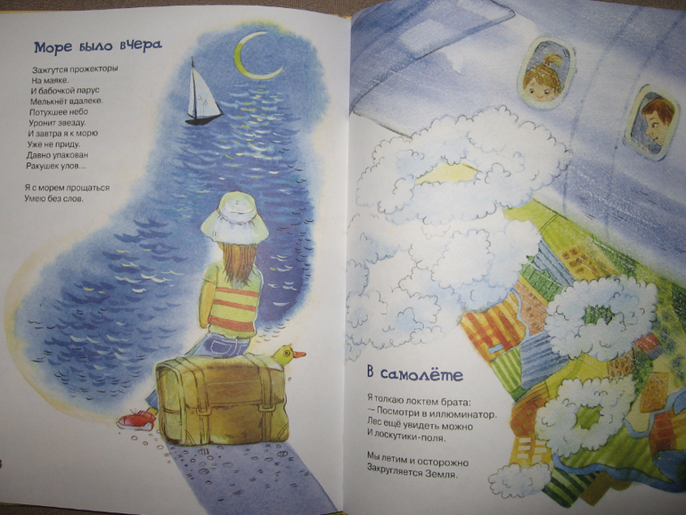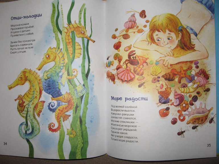 В книге два раздела: "Босиком бежим по лету" и "В животе у моря", т.е. книга очень-очень летняя получилась, такая "дачно-морская", "сладко-соленая" и теплая-теплая. Да и иллюстрации очень гармонично с текстами сочетаются.