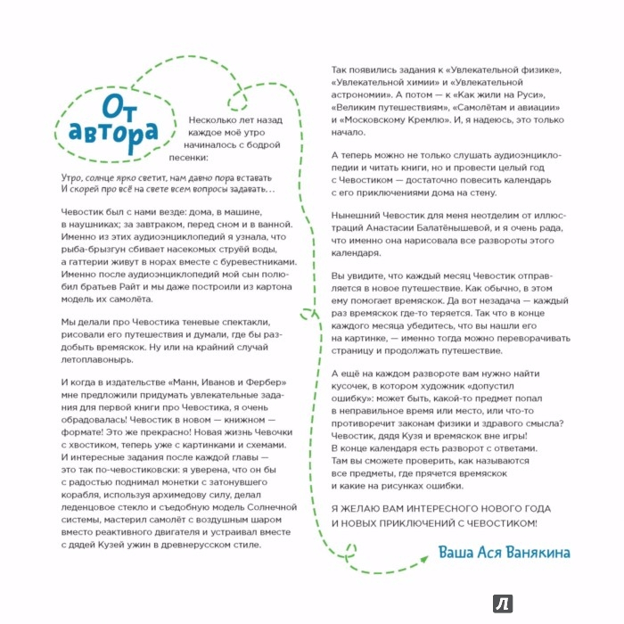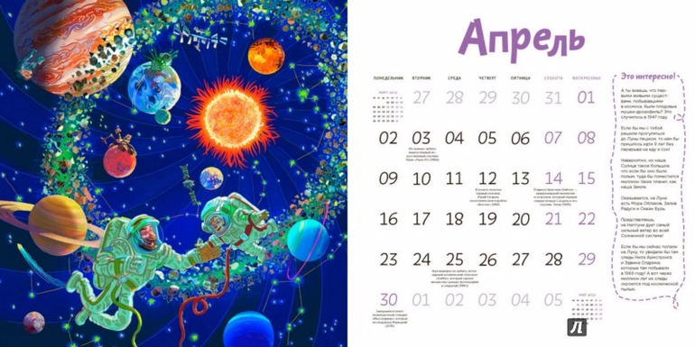 Это очень полезный календарь. Во-первых, он украсит любую комнату. Во-вторых, поможет тебе узнать много нового и проверить свои знания. Каждый разворот этого календаря посвящен какой-то теме - энциклопедии с Чевостиком. Например, астрономии или физике. А на иллюстрациях спрятаны сразу несколько заданий.