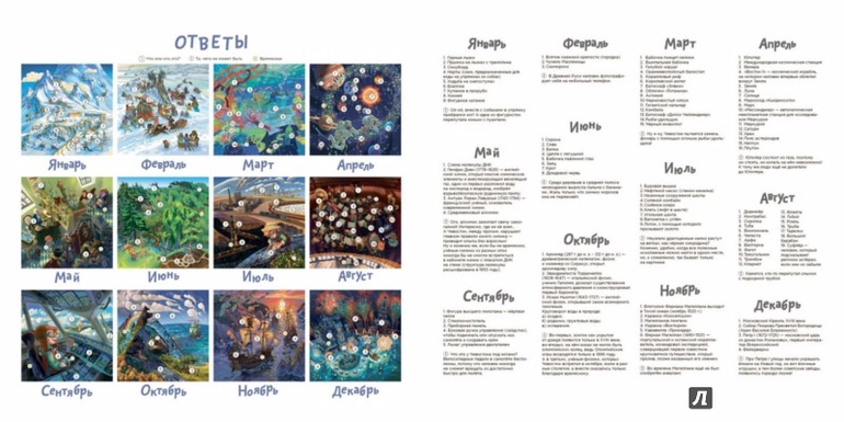 Каждый разворот - виммельбух, где нужно отыскать спрятанные детали (в конце календаря есть ответы).