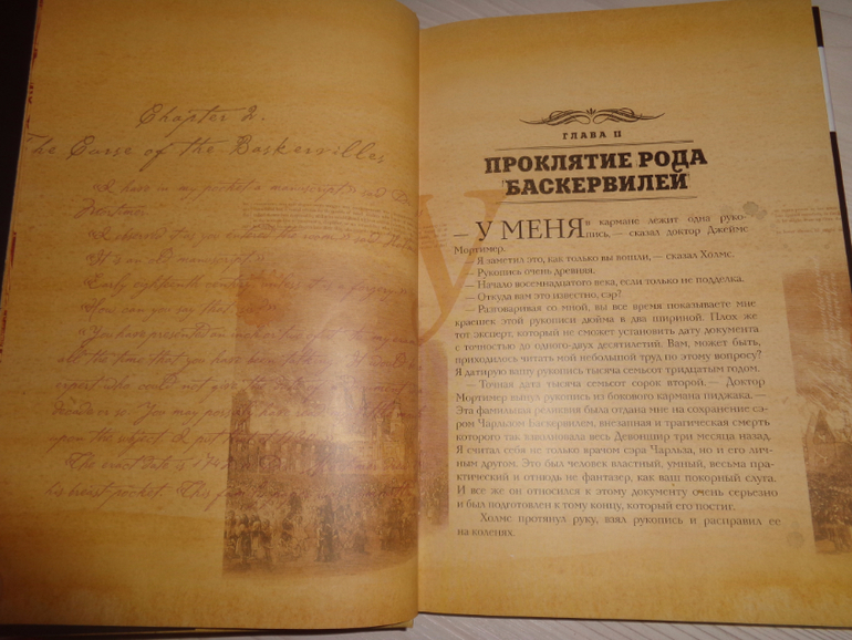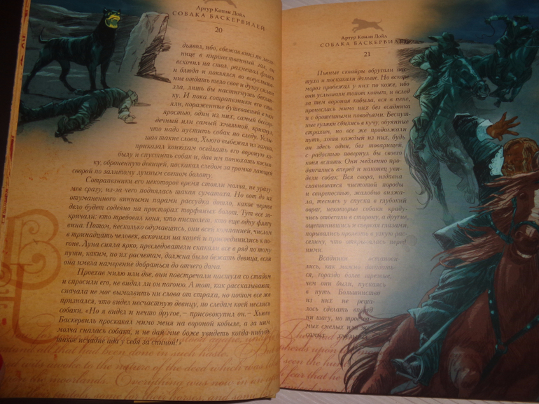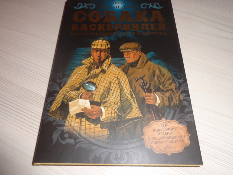 Долго выбирала Собаку Баскервилей от неожиданно полюбившего великого сыщика, остановилась на издании АСТ - книга классная! Обложка матовая с рисунком, имеется суперобложка, страницы мелованные плотные, неожиданно не белые! Иллюстраций на книгу немного, но каждый разворот оформлен зарисовками, фотографиями - очень здорово продуман макет! Сразу видно, что повесть, оформление, иллюстрации просто неотделимы друг от друга. АСТ молодцы!