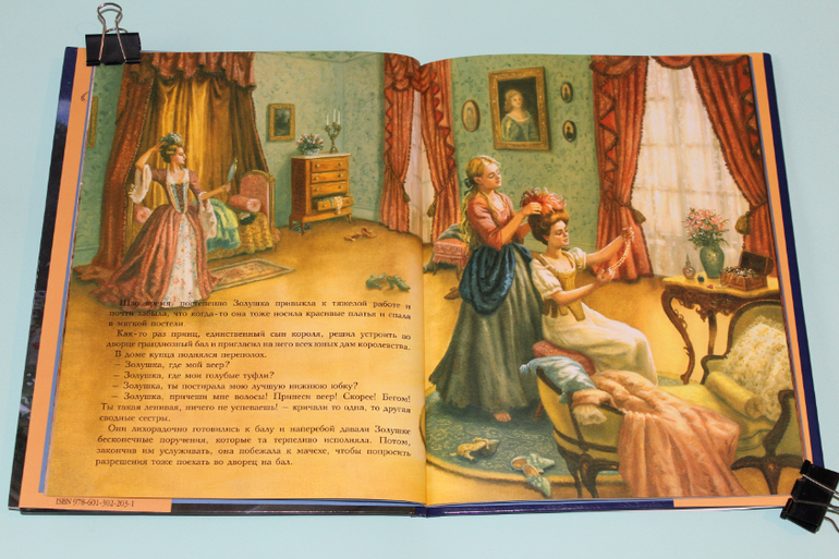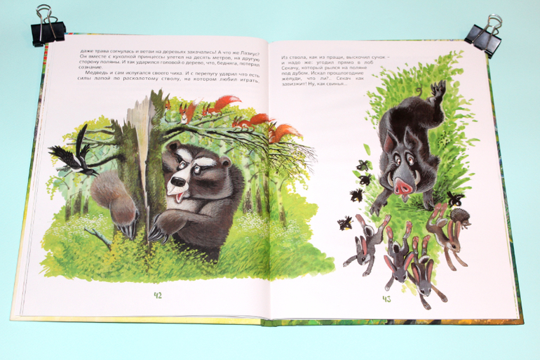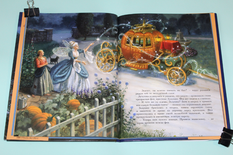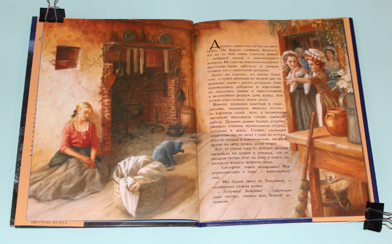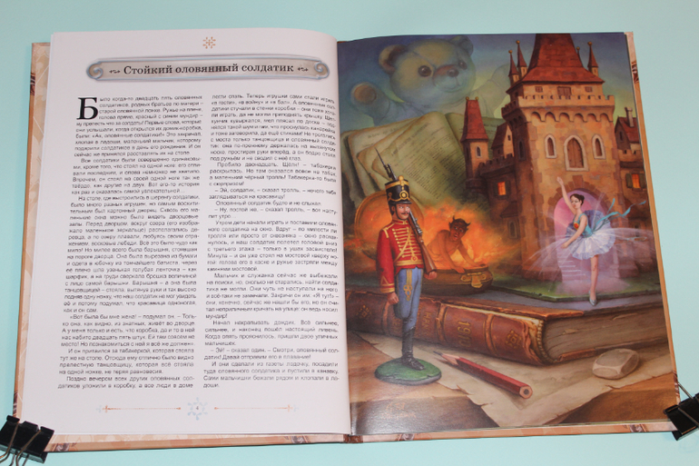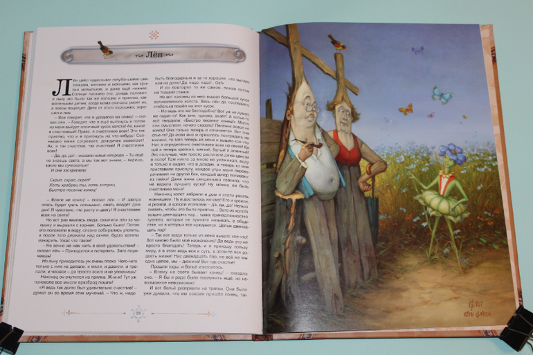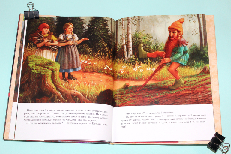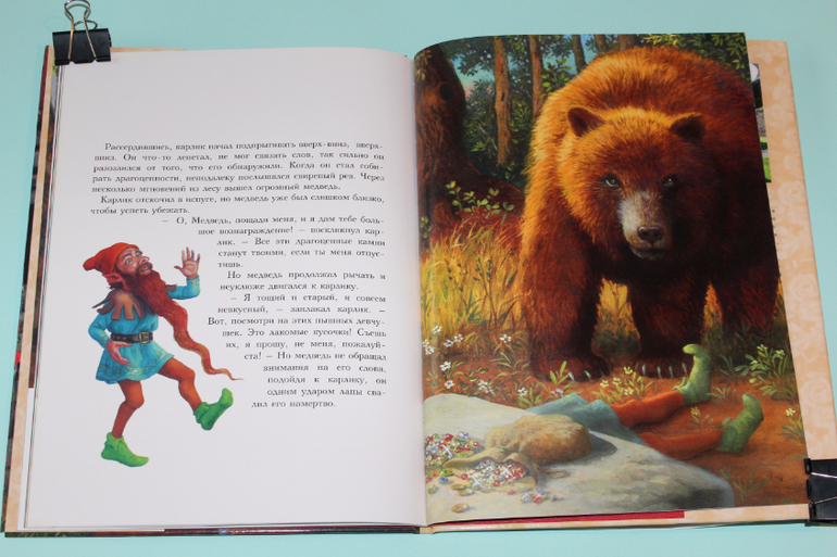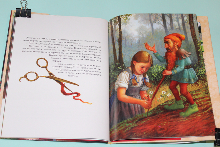 Есть в моей натуре задатки перфекциониста, поэтому было особенно приятно подметить, что каждая сказка в книге занимает ровно два разворота. На каждую сказку по две иллюстрации. Шрифт мелковат, но для чтения взрослыми детям вполне подходящий. Страницы плотная меловка. Буква ё на месте. Текст в два столбца. 32 сказочные страницы надёжно защищены твёрдым переплётом.