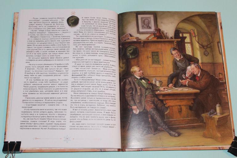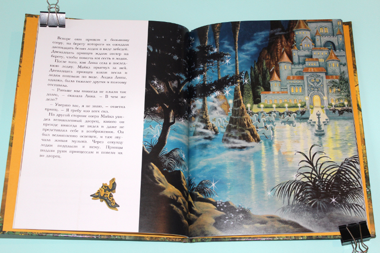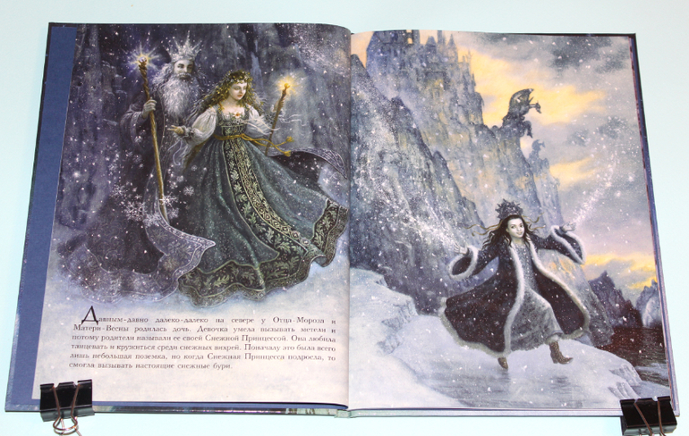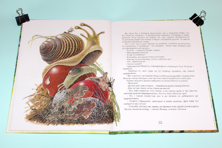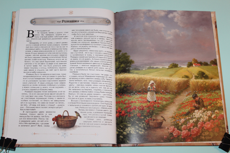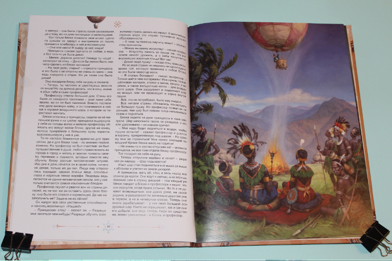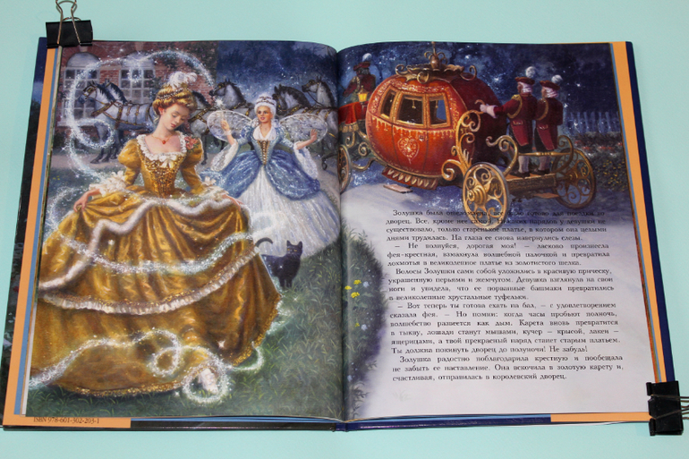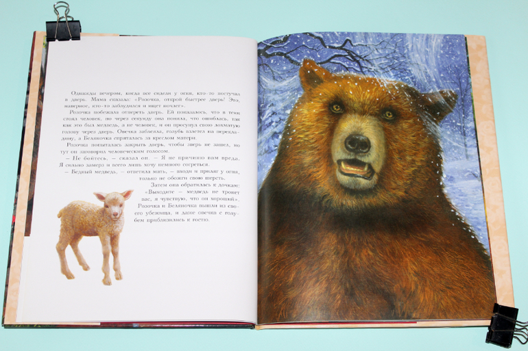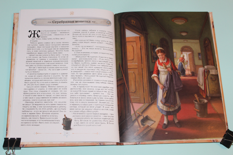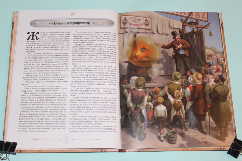 Есть в моей натуре задатки перфекциониста, поэтому было особенно приятно подметить, что каждая сказка в книге занимает ровно два разворота. На каждую сказку по две иллюстрации. Шрифт мелковат, но для чтения взрослыми детям вполне подходящий. Страницы плотная меловка. Буква ё на месте. Текст в два столбца. 32 сказочные страницы надёжно защищены твёрдым переплётом.