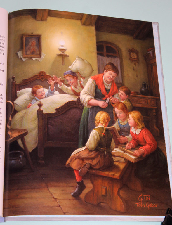 Бумага - плотная меловка. Буква ё на месте. Шрифт мелковат для самостоятельного чтения, но эту книгу лучше что бы читали родители, прижав к себе своих деток, уютно устроившись среди подушек и одеял)). На каждую историю приходится по две иллюстрации. Твёрдая обложка. Шикарные иллюстрации венгерсокго художника Габора Тота. Название на обложке сверкает и искрится.