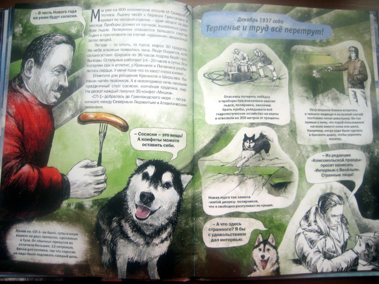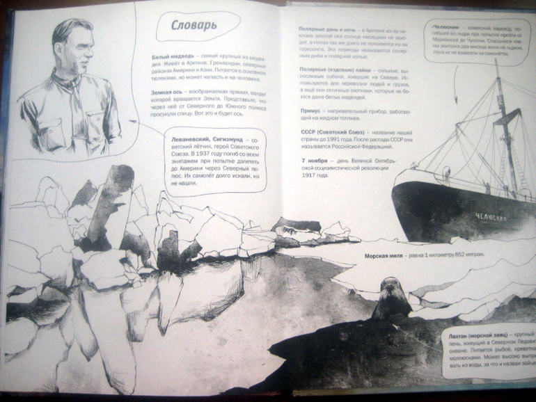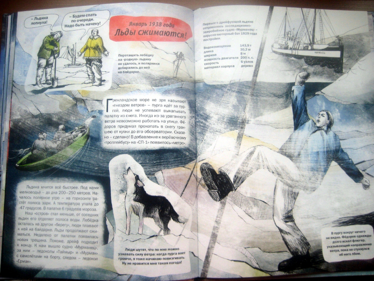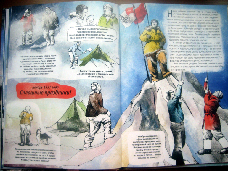 Давно себе говорю, что пора бросить их покупать и переключиться на что-то более серьезное, отличное от жанра комикса. Уж и сын вырастает... Но никак не удается. Только соберусь, а издательство - раз! - и книжку про знаменитую челюскинскую эпопею выпустит! Только я успею подумать, что вот бы хорошо еще про папанинцев издать... Как они нам - раз! - вот вам, пожалуйста, новинка. Загадала про перелет Чкалова и Громова через Северный полюс в Америку что-нибудь почитать. Ну и что бы вы думали? Вот уже и книжечка готова! Я и в детстве очень любила про всякие арктические исследовательские экспедиции читать, а уж теперь и подавно. Может, мне еще не поздно сменить профессию... :-)