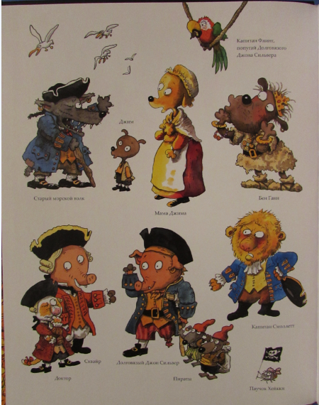 Как и в большинстве случаев, главными героями книг Маури Куннаса выступают животные. «Остров сокровищ» не исключение - собаки, коты, волк, свиньи, крокодил и даже змея. В роли попугая капитана Флинта - попугай.