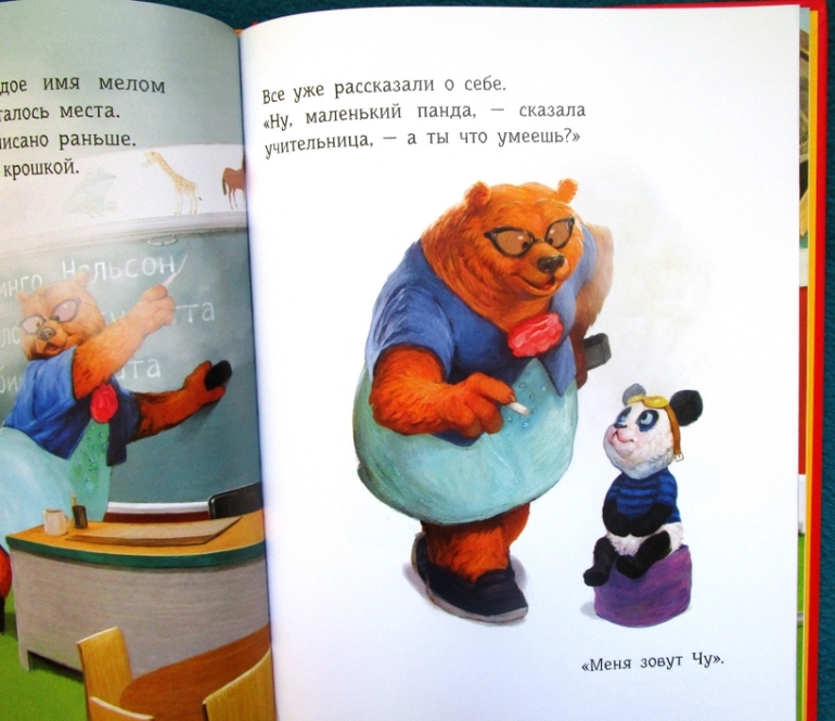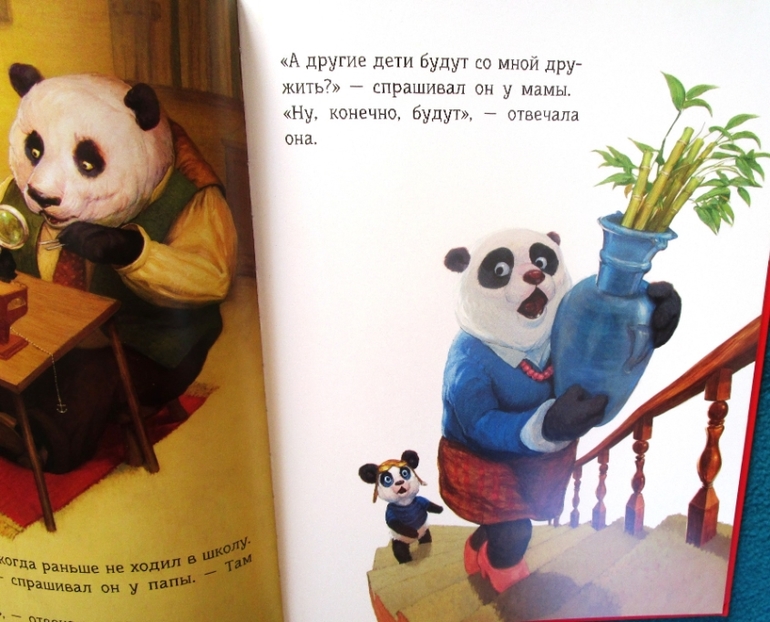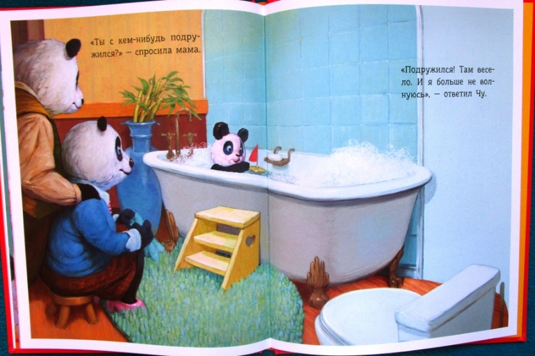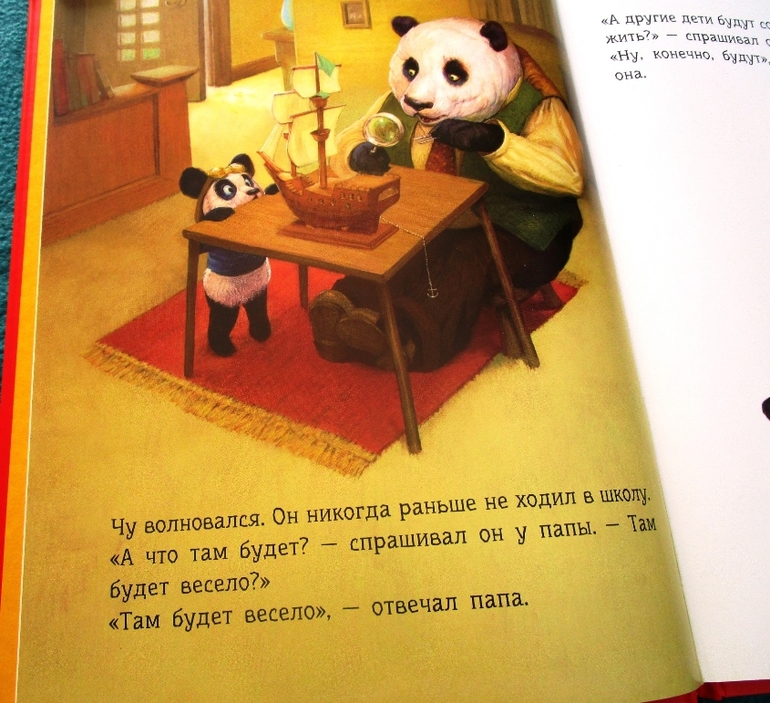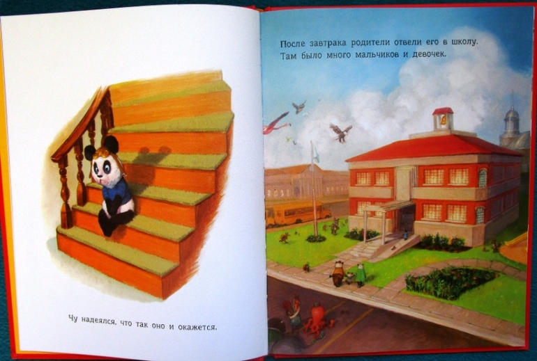 Интересное отличие этой книги в том, что здесь автор не стал рассказывать о вещах, распорядках, законах поведения в школе. Книга говорит об эмоциях, но не напрямую а между строк. Текст нацелен дать почувствовать эмоции малыша панды Чу: ему как и маленькому читателю/слушателю страшновато перед неизвестным «пойдешь в школу». Но уже на следующей странице страх проходит, его сменяют любопытство, интерес, веселье и спокойствие. Малышу панде становится спокойно в школе, а это главное. Автор не сказав ни слова об учебном процессе, сумел передать положительные эмоции панды от школы. И панда школы не будет бояться, и мой парень тоже - важно ведь первое впечатление, а с такими книжками мы еще до школы переживаем знакомство с ней. И это управляемый процесс с заведомо положительным исходом.