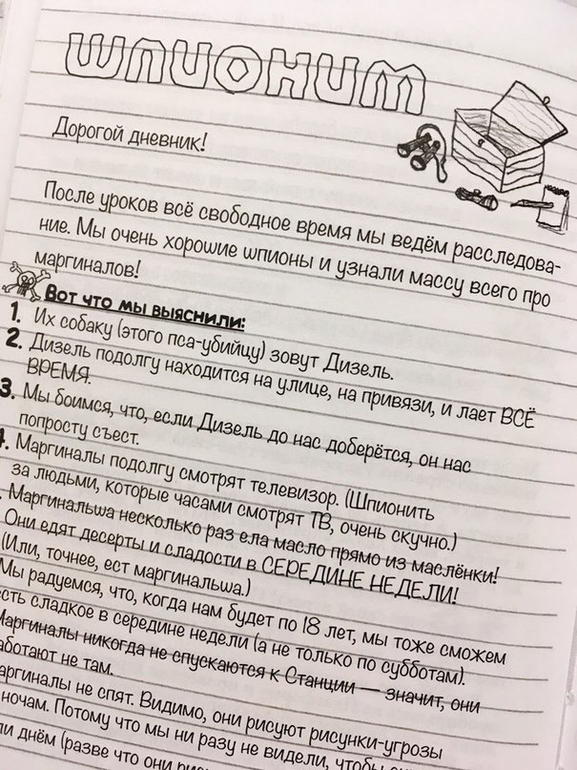 Время 20.02, 11.11, какого цвета машина проедет, кто куда посмотрел и тд. Может автор опубликовала свой собственный детский дневник?) Интересные зарисовки повсюду, очень оживляют книгу. Создаётся впечатление, будто читаешь настоящий дневник))