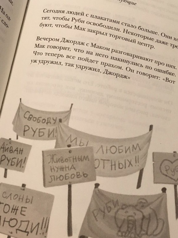 Это реальная история меня очень тронула! В книге завязка немного в другом. Айван рисует картины и спасает своего друга Слона Руби. Повествование идёт от первого лица, от лица сильвербэка Айвана. Ещё детенышем его с сестрой забрали у родителей и вывезли из Конго, сестра не вынесла этого, а сам Айван оказался в тесной клетке в торговом центре Атланты. Сначала он был звездой, на него специально приезжали посмотреть. Но со временем к Айвану привыкли, да и он сам постарел. Его картины продавались в сувенирном магазине. Вообще единственное, что мог Айван- это рисовать и благодаря этому умению, он нашёл выход как высвободить малышку Руби из заточения. В первой половине книги идет описание того как Айвану скучно, мне показалось эта часть немного затянута. Скучно читать о скучном:) Но, повторюсь сама история Айвана меня очень тронула!