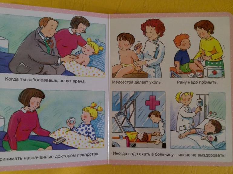 Эту книжку мы подарили Владику, когда ему было 1 год и 9 месяцев. Книжка была фаворитом очень долгое время:-) Владика интересовало все - как мы слышим, как едим, что чувствуем, но особый интерес вызывала страничка, где к больному приходит доктор:-)