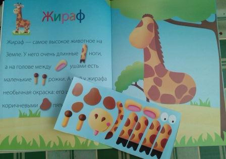 Издательство Эксмо-пресс. Формат А4. В книжечке 6 животных (в книжке "Животные Африки" слон, жираф, лев, зебра, бегемот, обезьяна). С одной стороны простенький текст, с другой лист для наклеек. Моему в 2,7 просто, за раз сделали всю книжку. Усложняла задания счётом ног, ушей и хвостов)))) Но в целом, мне понравилось. Быстро и с огромным удовольствием повторили животных.