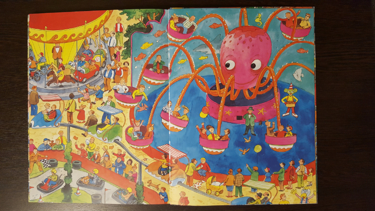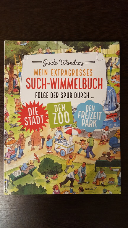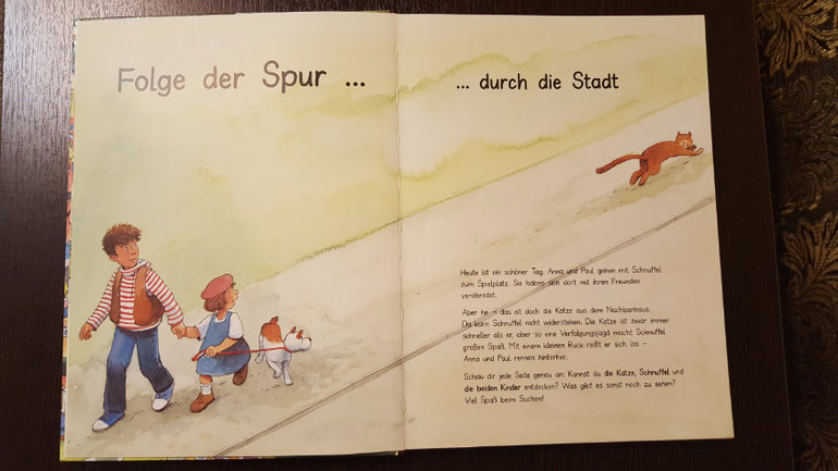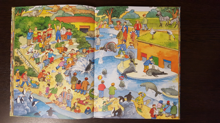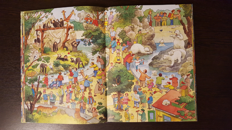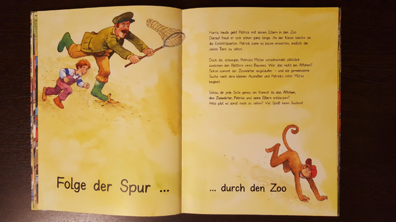 Эта книга на менецком языке, нам ее привезла сестра из Германии. И дочь сразу в нее влюбилась. В ней 3 раздела. В городе, в зоопарке и в парке аттракционов. В каждом разделе свое, так сказать, задание. В парке мы ищем потерявшуюся собачку, в зоопарке обезьянку, которая украла у мальчика кепку.