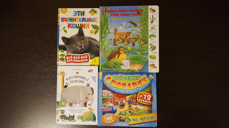Про кошек старая, самая первая можно сказать. Кошки - это наша слабость. "Кто пришел потом" - смотрит не так часто. Поиграла и забыла. "Мой первый словарик" любит до сих пор, давно она у нас. Может причина в окошечках.