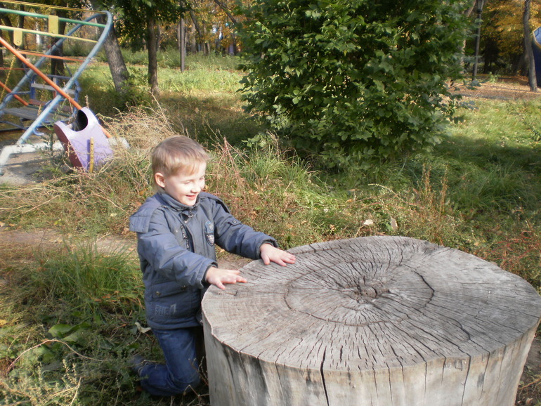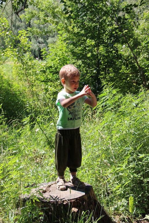 Вообще все дети очень любят любые встреченные пеньки. Мы, стоя на них, всегда стихи рассказываем, как раньше на табуретках. Вот Родик рассказывает "На полянке теремок, из трубы идет дымок"