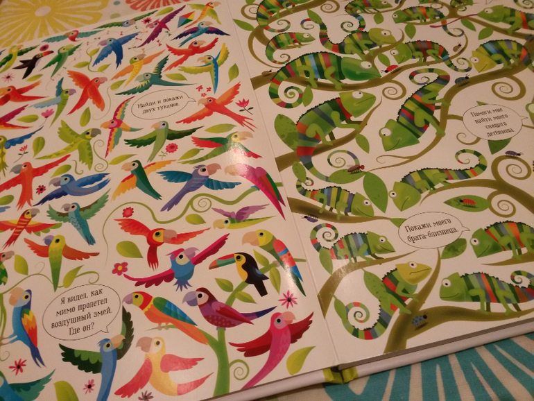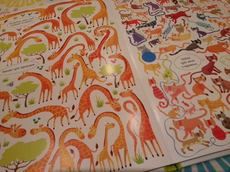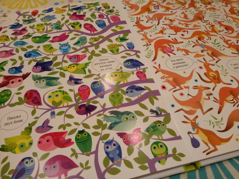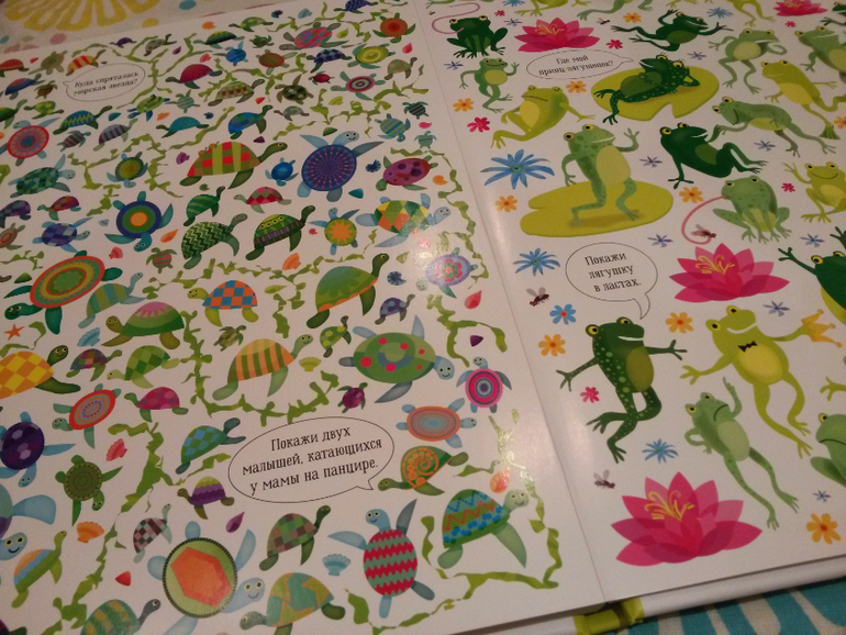 В книге про животных картинки помельче и задания на поиск посложнее, как нам показалось, чем в Подводном мире. И это здорово, потому что Подводный мир Илюха уже наизусть выучил и щелкает задания, как орешки, придумываем новые. Так что книга и на вырост. Леночка, еще раз спасибо!!!