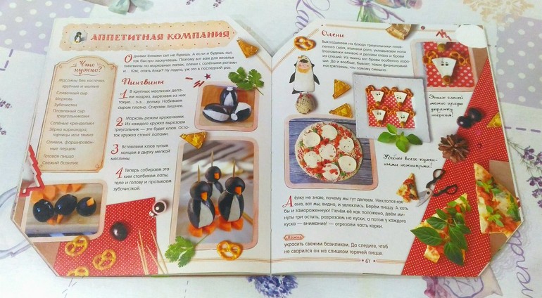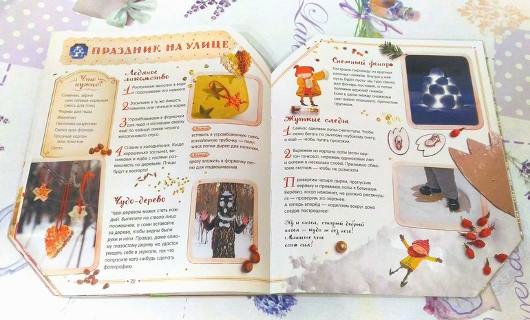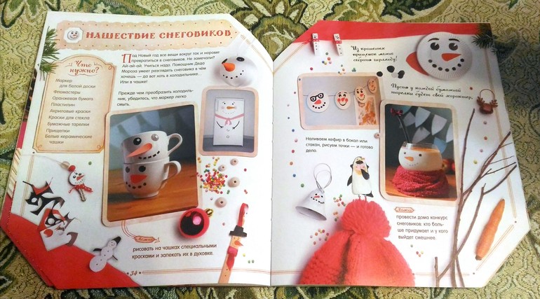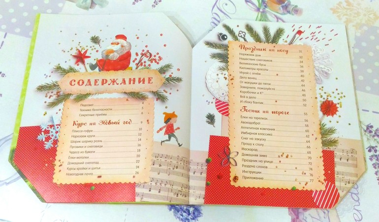 Поделки интересные, разные и их много. На тему украшений для дома и елки, поздравительные открытки, есть тема "Гости на пороге" в ней рецепты чем угощать гостей и как красиво подать, во что поиграть. В приложениях есть выкройки и схемы, а еще авторская бумага для поделок.